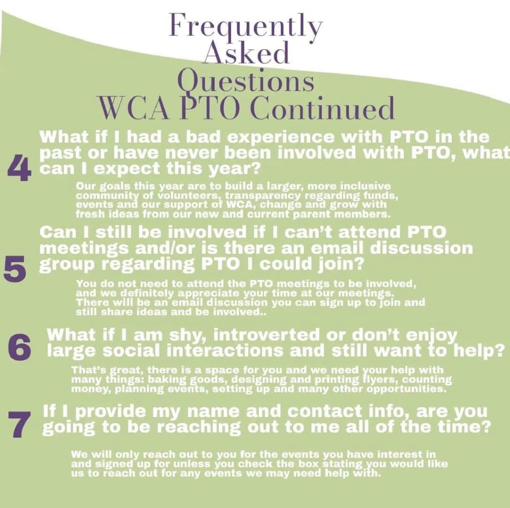 Please reach out to us at wca.pto@gmail.com with any other questions or concerns!